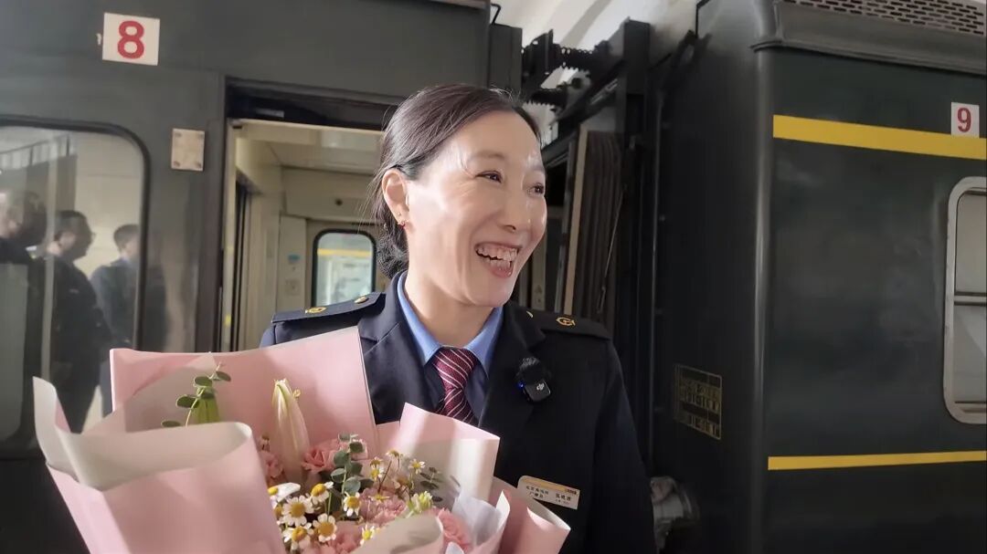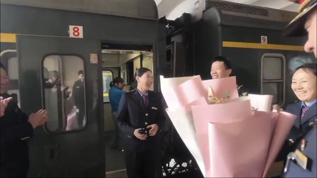 一句句朴实的语言,尽是并肩同事的情感与不舍。燕姐合手着对讲机,眼眶一忽儿泛红,她强忍着泪水,嘴角却不自愿地上扬,不舍与快活交汇在脸上,仅仅轻轻应和着,恢复着每一位同事的道贺。当她打理完行装走下车厢时,同事们早已捧着鲜花恭候在车厢外,递上这份和蔼,莫得过多的语言,却胜似千言。