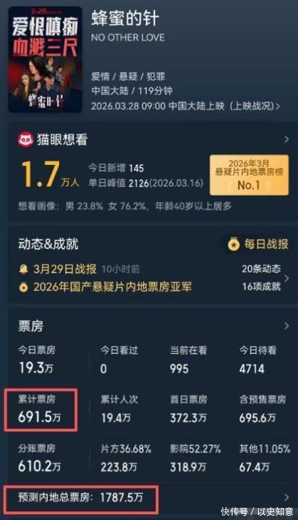 投资高达一亿元东谈主民币的《蜂蜜的针》,最终仅斩获1787万元票房,连制作资本的零头王人未能覆盖。