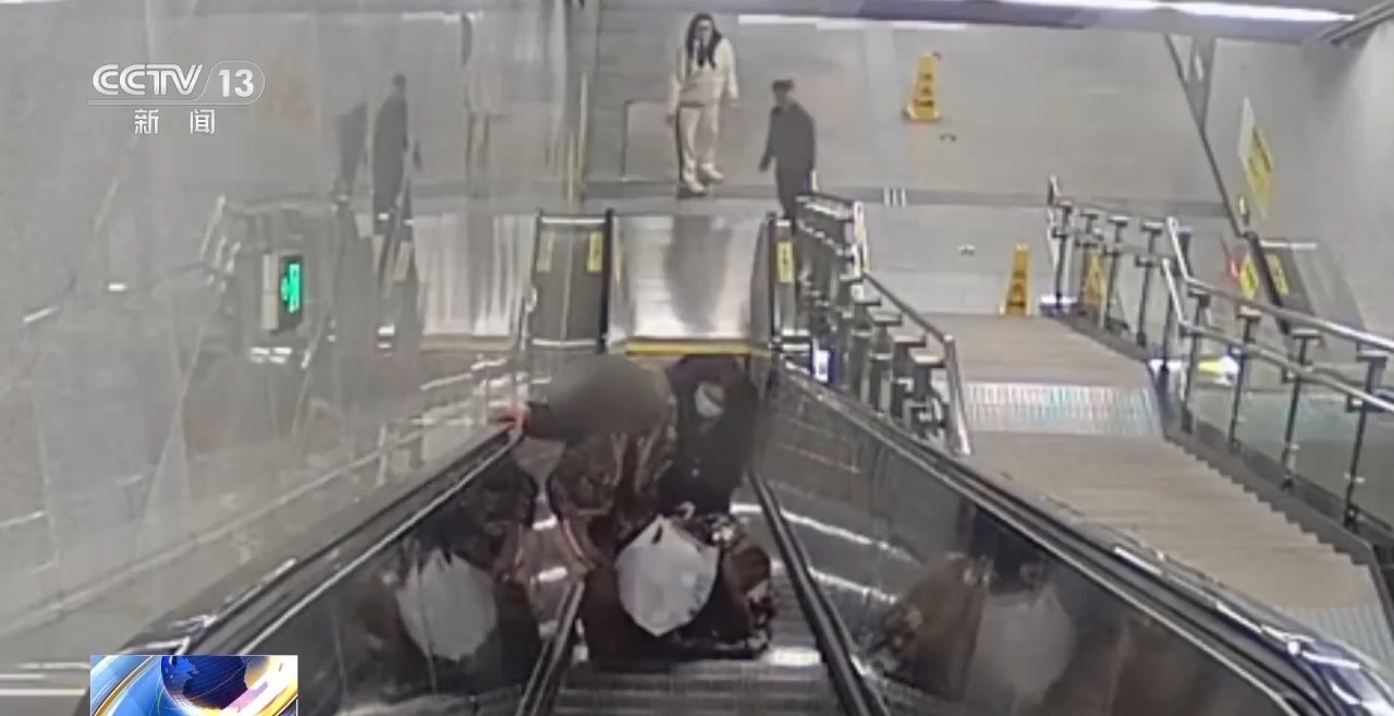 其时,这位老东说念主一手拉入部下手推车、一手提着购物袋,刚踏上上行扶梯不久,躯壳一刹失衡,倒在扶梯扶手上。此时,正赶往岗亭上班的站务员舒潘正巧从下行电梯下来,发现险情后,她坐窝疾驰曩昔。
