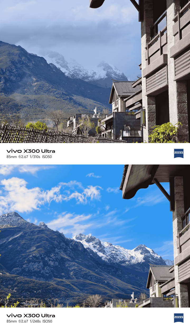 但你仔细对比会发现,两张样张里的雪山表情有 60% 不同,尤其是雪峰顶部那一块更是被AI 识别成云层,径直被抹除,临了导致看起来确乎面子了不少,但时势像是手机我方画出来的。