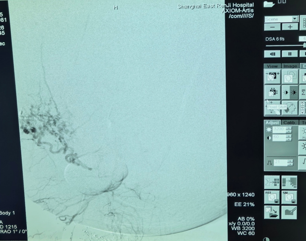第一棒交给肿瘤介入科主任张学彬。在DSA(数字减影血管造影)的精确疏导下,张学彬凭借娴熟的时代,顺利找到并栓塞了肿瘤的多支润泽动脉,为后续手术撤消了最大的“路障”。