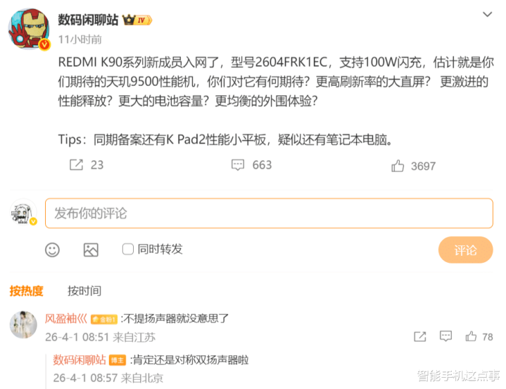 再看芯片,红米K90至尊版基本阐述会搭载天玑9500。